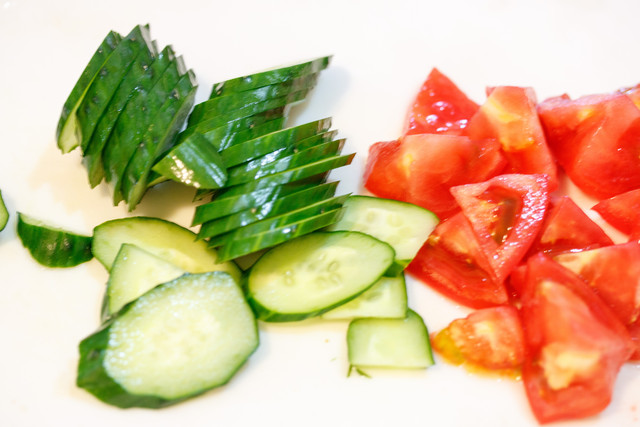 トマトときゅうりを切って