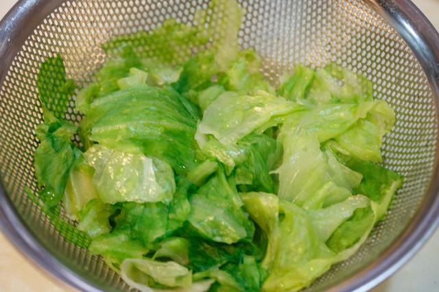レタスをちぎってお湯をかけ