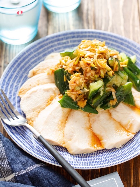 鶏むね肉をレンジでチンして蒸し鶏にし、叩いて割ったきゅうりを乗せて、ねぎたっぷりの香味だれをかけました。最後に蒸し鶏を切る作業はでてきますが、長ネギをキッチンバサミで切れば、ほぼほぼ包丁いらずでできるお手軽さ!!しかもレンジでできるので、暑い夏にはもってこいの一品です。