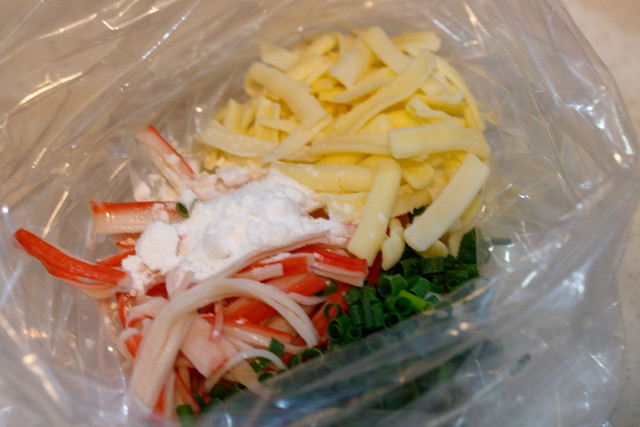 使う食材は、はんぺん・ねぎ・ピザ用チーズに、一正蒲鉾さんのサラダスティック。これらをポリ袋でモミモミして、あとはフライパンでサッと焼くだけ。しっかり味がついているので、ソースいらずでお弁当にも入れやすい!また、包丁いらず&ポリ袋1枚でできるので、バタバタ忙しい朝にも最適です。