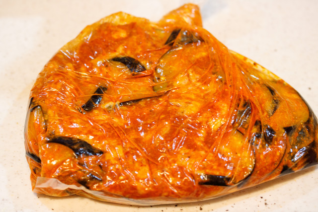 ポリ袋に豚バラとなすを入れて