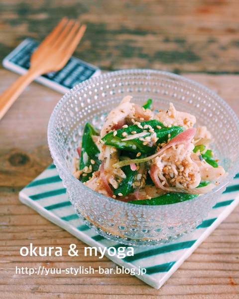 『蒸し鶏とオクラとみょうがの梅あえ』
