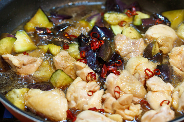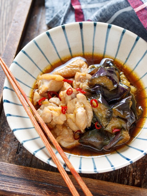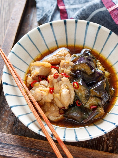 なすと鶏もも肉を甘辛く煮た