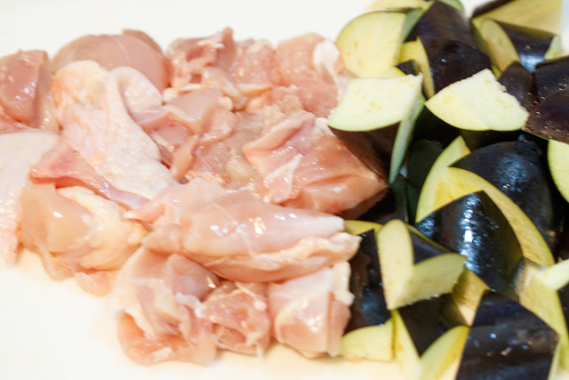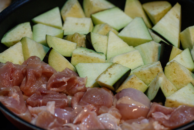 なすと鶏もも肉をフライパンでサッと焼き
