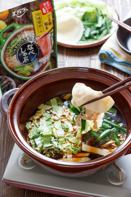 エバラさんのなべしゃぶ 柑橘醤油つゆを使った新感覚のしゃぶしゃぶ!餃子の皮で包んで食べれば、モチモチ食感に。また、なべしゃぶは、お鍋としゃぶしゃぶのおいしいとこどり。味はしっかり野菜もたっぷり食べれる上、あっさり食べれるので、年中通して大活躍です♪