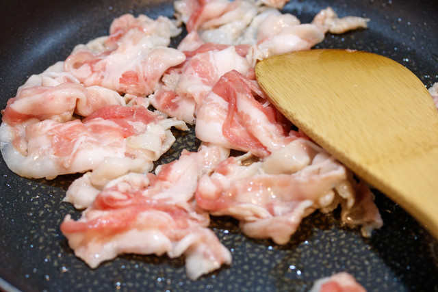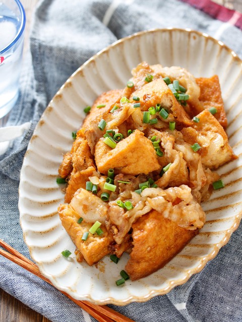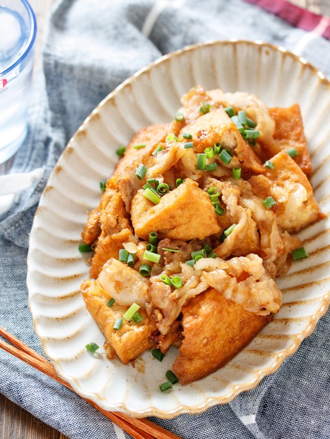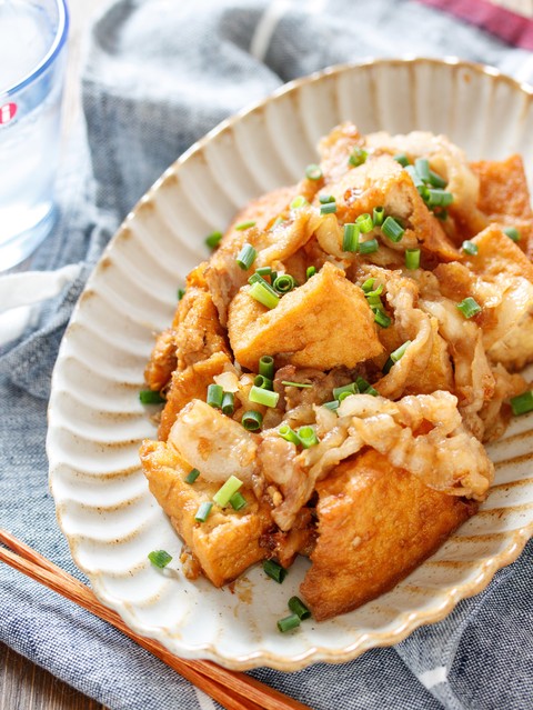 包丁不要!5分でできる激ウマメイン!作り方は、とーっても簡単で、フライパンで豚バラを炒め、手でちぎった厚揚げを加えたら、あとは、おかか醤油を絡めるだけ。たったこれだけだけど、豚バラとかつお節の旨味を吸った厚揚げがめちゃめちゃ美味しい!!厚揚げにおかか醤油って組み合わせは間違いなく美味しんで、これに豚バラを加えれば手軽にメインおかずが完成です♡