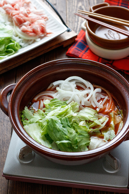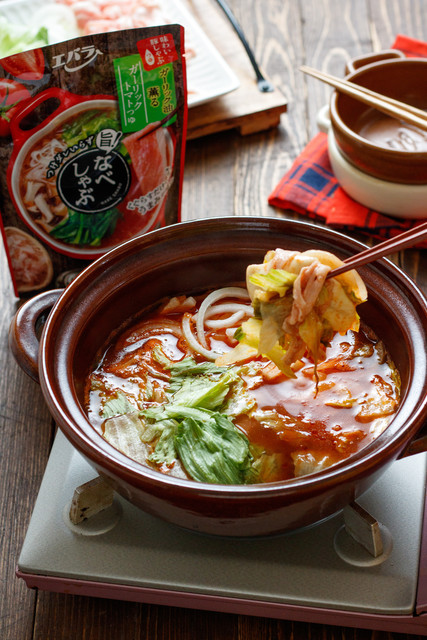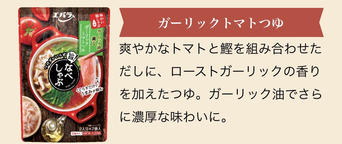 エバラさんのなべしゃぶ ガーリックトマトつゆを使った新感覚のしゃぶしゃぶ。レタスと玉ねぎをたっぷり入れてモッツァレラチーズとともに豚肉で包んで食べると、まるでピザを食べているよう!ガーリックの効いたトマトベースのつゆなので、スタミナをつけたい夏にもオススメです!