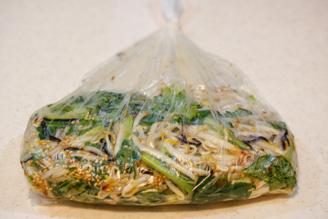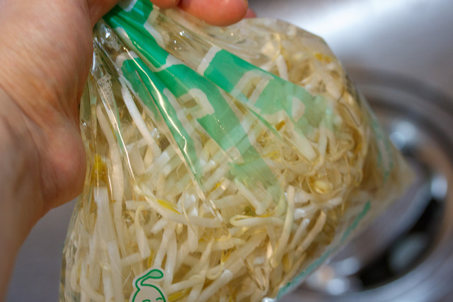 耐熱性のポリ袋に、小松菜ともやし
