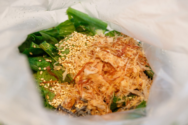 そして、塩昆布やかつお節を入れて口を閉じ