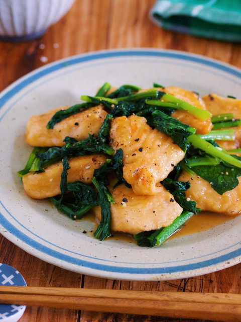 ご飯もお酒も止まらないっ!『鶏むね肉と小松菜のガリバタ醤油ソテー』