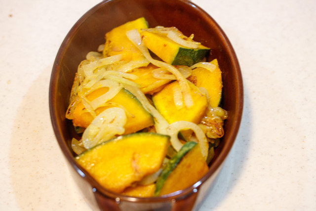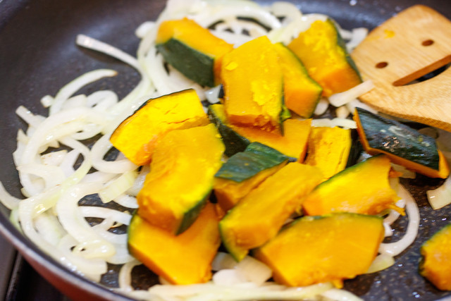 フライパンでかぼちゃと玉ねぎを炒めて耐熱容器に。