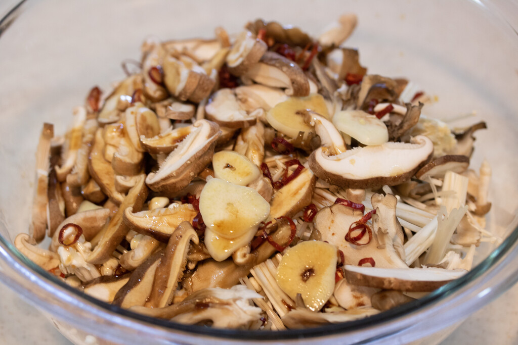 下処理したきのこに調味料を回しかけ