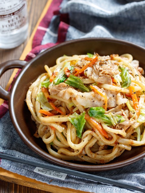お休みの日のランチや冷蔵庫のお掃除にぴったり♪豚肉と余り野菜、そして冷凍うどんがあればできる旨味たっぷりの焼きうどん♡作り方は、とーっても簡単で、フライパンで豚肉・お野菜・解凍したうどんを炒めあとは、バター醤油+かつお節を絡めるだけ♪たったこれだけだけど、バター醤油のコクと香ばしさ、そしてかつお節の旨味が絡んでうどんも野菜もモリモリいける!!