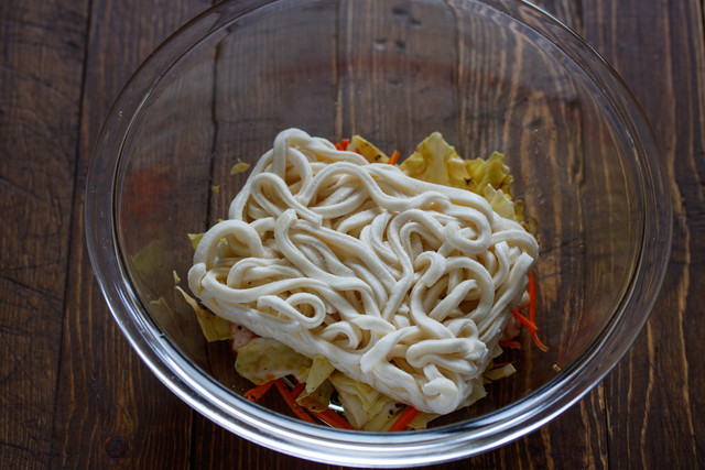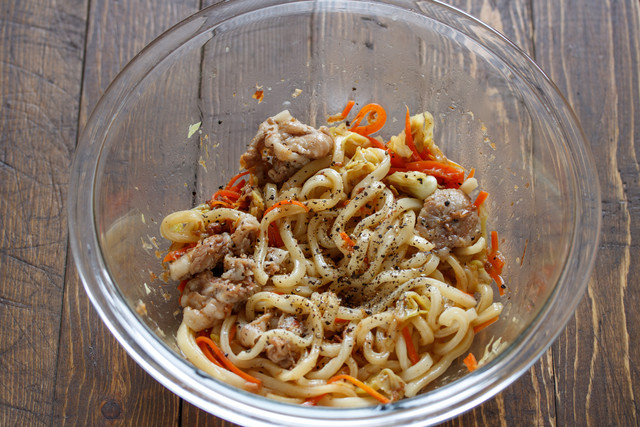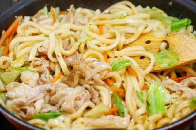 フライパンで豚肉・お野菜・解凍したうどんを炒め