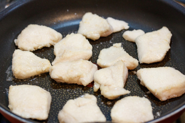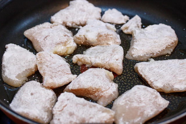 鶏むね肉に下味をつけて片栗粉をまぶし