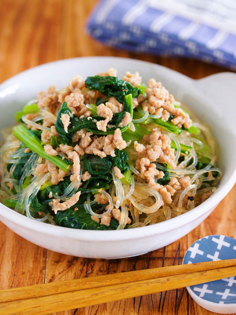 めんつゆ de『小松菜そぼろと春雨のだしうま煮』