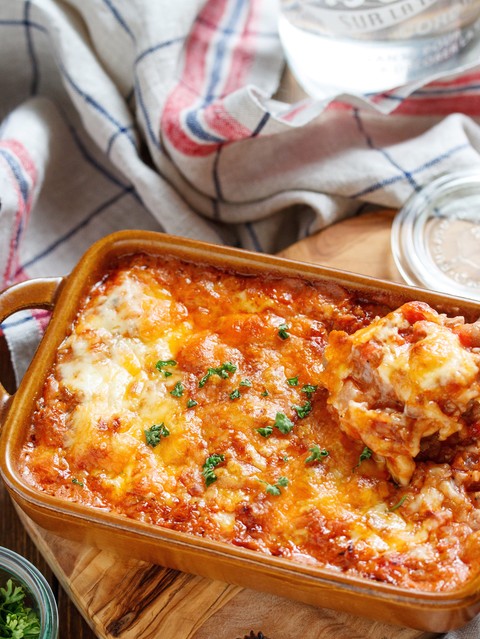 餃子の皮を使った、チーズがとろ〜り即席ラザニア♪作り方は、とーっても簡単で、フライパンでひき肉と玉ねぎを炒めて、トマト缶+ケチャップで2〜3分コトコト。あとは豆乳を加えたら、耐熱容器に、チーズ→餃子の皮→ミートソースの順に重ねトースターで焼くだけ♡たったこれだけだけど、餃子の皮がモッチモチで食べ応え抜群!見た目も華やかなので、クリスマスにもオススメです♪