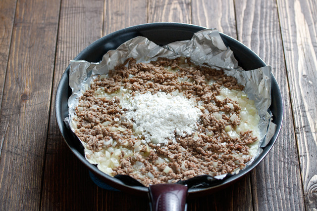 2.フライパンにキチントさんフライパン用ホイルシートを敷き、1・合挽き肉を入れて中火にかける。時々上下を返しながら焼き(炒めるというよりは焼くイメージ)、合挽き肉の色が変わったら、薄力粉を加えてスプーンなどで混ぜ合わせる。