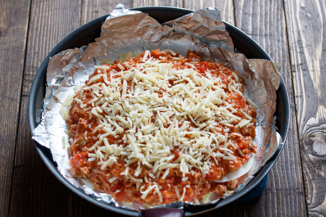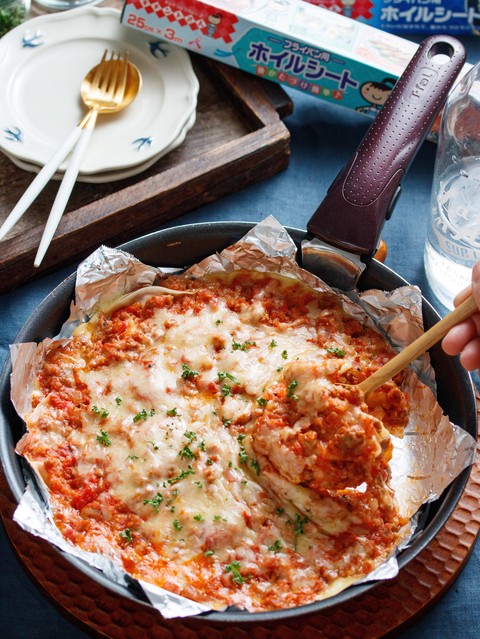 フライパン一つでできるワンパンラザニア♪キチントさんフライパン用ホイルシートを使えば、フライパンが汚れたり、チーズなどが付着したりしないので、後片付けもラクラク!そして、オイルが不要になる上、くっつかないので炒める作業も不要!フライパンを火にかけて、時々サッと混ぜたり重ねたりするだけなので、お子様と一緒にお話しながら作るのもオススメですよ♡