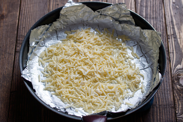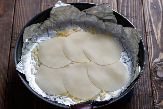 4.フライパンに新しいキチントさんフライパン用ホイルシートを敷き、ピザ用チーズ→餃子の皮6枚→3の1/2量の順に重ね、これをもう1セット続け、一番上にピザ用チーズを散らす。中火にかけ、ふつふつしてきたら蓋をし、弱火で10分ほど蒸し焼きにする。