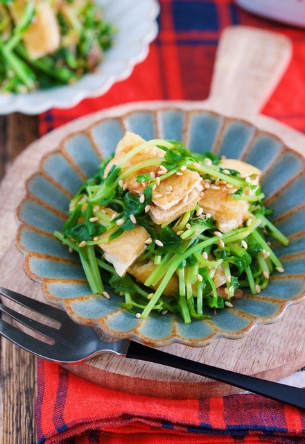 『豆苗と油揚げのおかかポン酢蒸し』