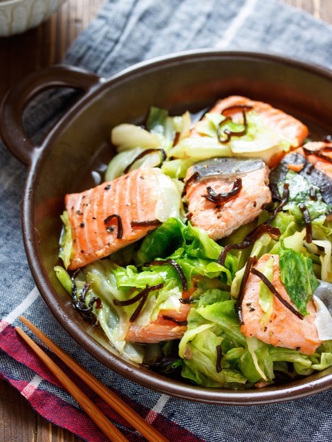 鮭とキャベツの塩昆布バター蒸し