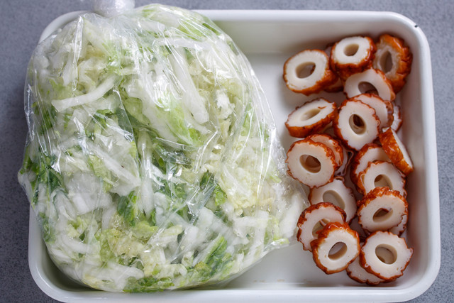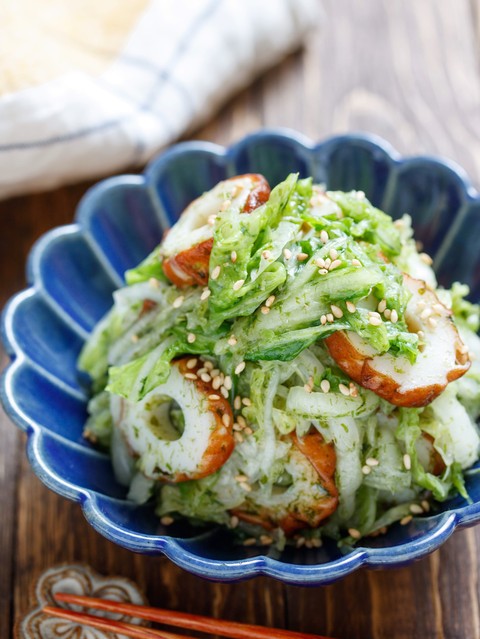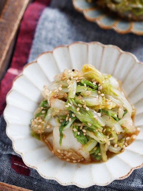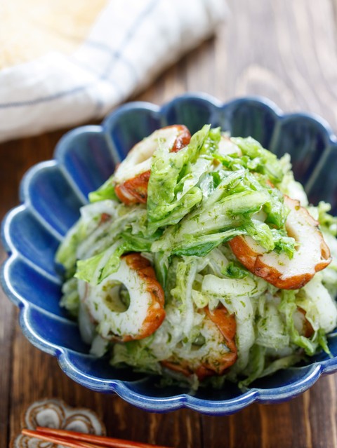白菜の大量消費や、お酒のおつまみに最適♪作り方は、とっても簡単で、ちぎった白菜を塩もみし、あとは、ちくわ・青のり・塩・ごま油で和えるだけ♪ とってもシンプルだけど、ちくわの旨味と青のりの磯の香りで、淡白な白菜がモリモリいける。また、シンプルな塩味だからこそ、白菜の旨味を感じられる一品です♡