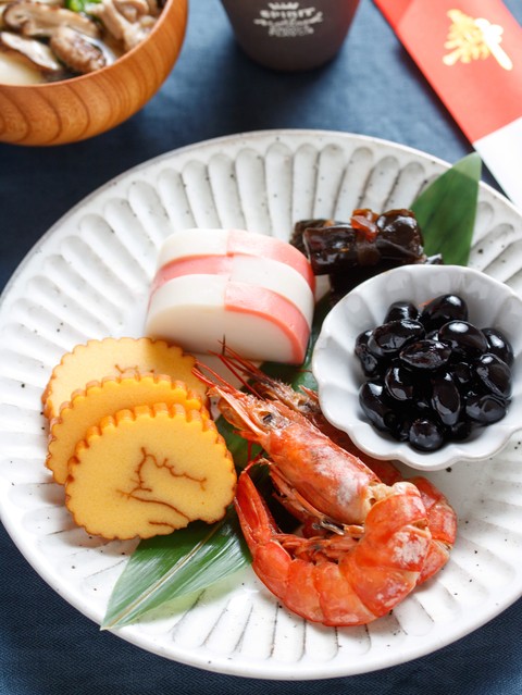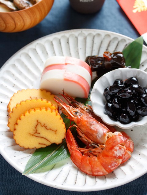 海老のうま煮・黒豆・昆布巻き
