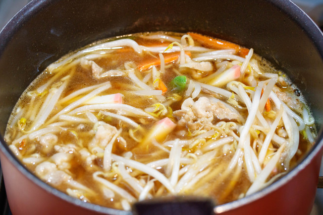 もやしをたっぷり使ったちゃんぽん風のスープ♡お正月...食べ過ぎて体重が右肩上がり...。それに加えて出費も多かったのではないでしょうか?こんな時は”もやし”が大活躍!1袋ドドーンと入れれば、お財布にも身体にも嬉しい♡また、おせちで残った”かまぼこ”のほか、筑前煮を作った時に余った”にんじん”や”絹さや”もありませんか?これらも、一緒にスープに入れて、消費してしまいましょう♪