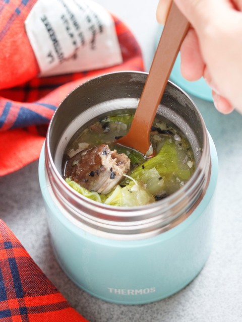 寒い季節にぴったり!スープジャーを使った、ほっこり煮物♪作り方は、とっても簡単で、小鍋に出汁と味噌を合わせて沸騰させ、あとはサバ缶と手でちぎった白菜を加えて、サッと煮るだけ。包丁いらずでできる上、栄養もたっぷり♡味噌としょうがのパワーで、身体も芯から温まりますよ♪