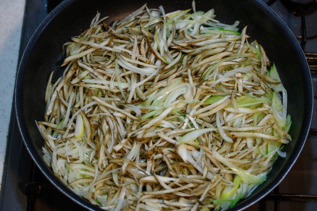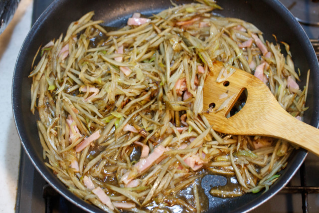 長ネギ・ごぼう・ベーコンをフライパンで炒めて