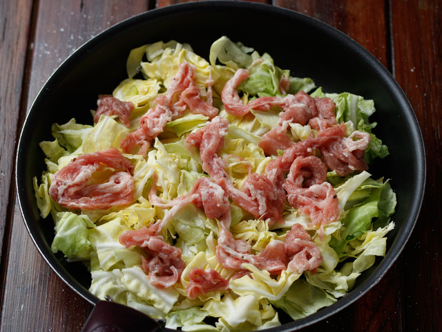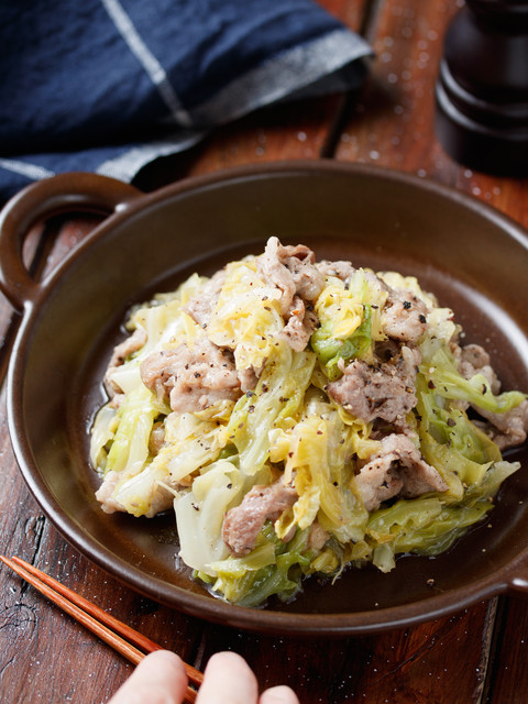 包丁不要!重ねて蒸すだけで完成のお手軽メイン!!使う食材は、豚こま×キャベツ。これらをフライパンに交互に重ね、あとは6分ほど火にかけるだけ。たったこれだけだけど、下味マジック&蒸し上げることで、豚こまはしっとり柔らか♡そして、シンプルな塩だれがキャベツの甘みを引き立てます。ご飯にもお酒にもぴったりなんで、機会がありましたら、ぜひ!!