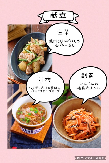 | ・鶏もも肉 1枚(300g) ・ベーコン 2枚 | ・新じゃがいも 3個(300g) ・アスパラ 3本 ・にんじん 1と1/3本 ・えのきだけ 小1/2袋(50g) ・塩昆布 5g ・切り干し大根 10g |