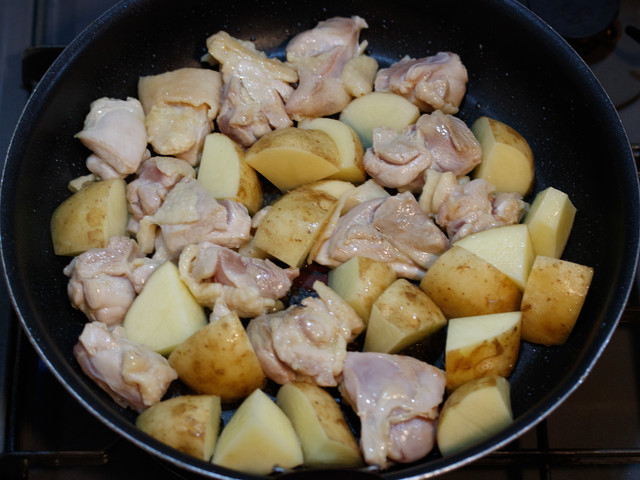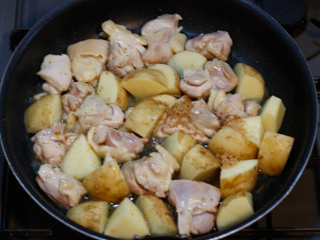 鶏肉とじゃがいもをフライパンで炒め