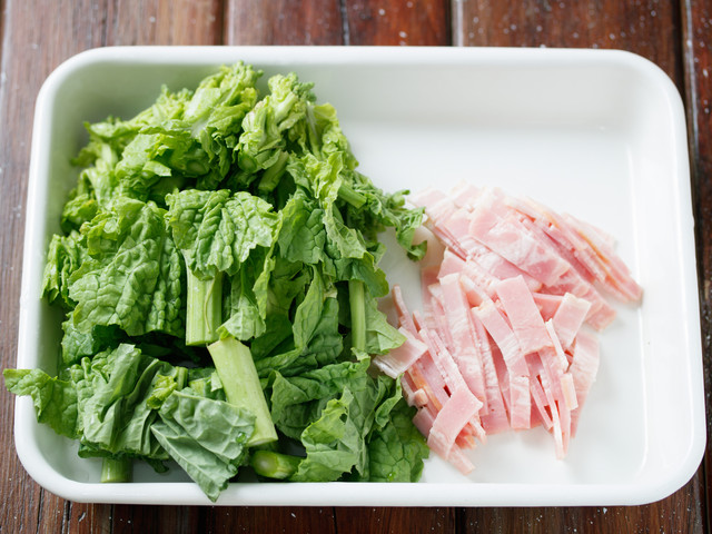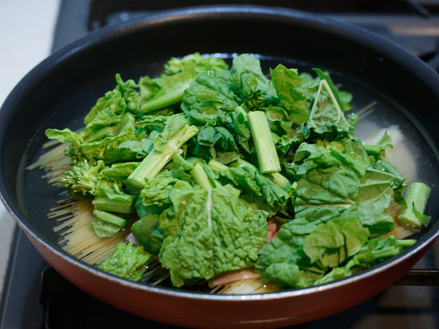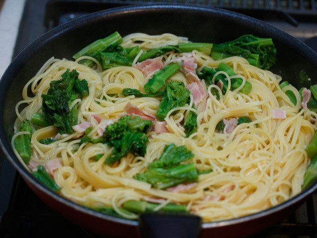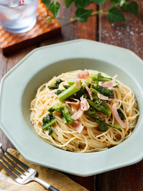 菜の花とベーコンのうましょうゆパスタ【#時短#ワンパン】