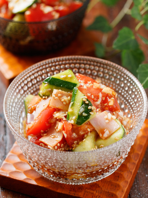 暑い季節にぴったりの、さっぱり副菜♪ 作り方は、めちゃめちゃ簡単で、トマトときゅうりを乱切りにし、あとは、長ネギとハムが入った香味だれで和えるだけ。たったこれだけだけど、旨味がたっぷりで、汁まで飲み干す勢い!! しかも、切って和えるだけなのに、作り置きもできちゃうスグレモノ♪