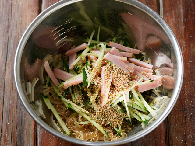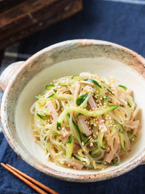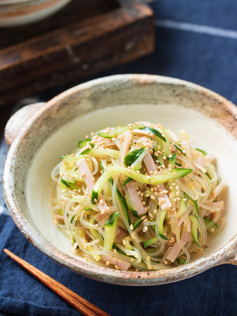 シャキシャキつるつる食感が楽しい、夏向きのさっぱりサラダ。 作り方は、めちゃめちゃ簡単で、春雨ともやしを一緒に茹で、あとは、千切りにしたきゅうりとハム・調味料を加えて混ぜ合わせるだけ。たったこれだけだけど、味がしみしみで、ボウルごと抱えて食べる勢い♡ ポイントは、調味料の加え方!!面倒なので、一気に加えてしまっても間違いではないのですが、春雨ともやしが熱いうちに一度調味料を絡め、ちょっと粗熱が取れてからごま油やごま類を加えると◎。 こうすることで、味が染みにくい春雨ともやしにも味が染み染み。冷めても味がボケません♡