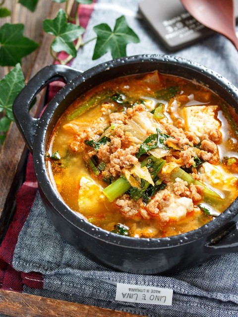 豚ひき肉と小松菜のチゲ風おかずスープ