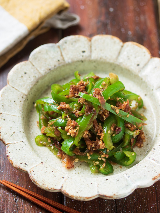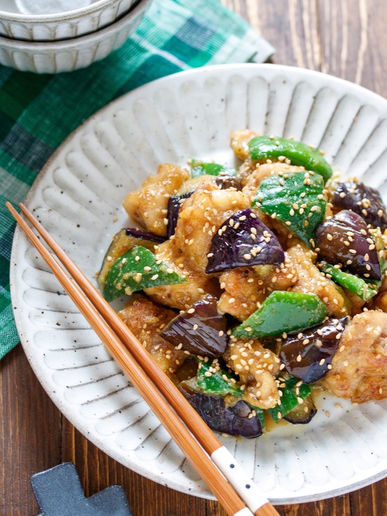 鶏肉となすとピーマンのにんにくごま味噌炒め
