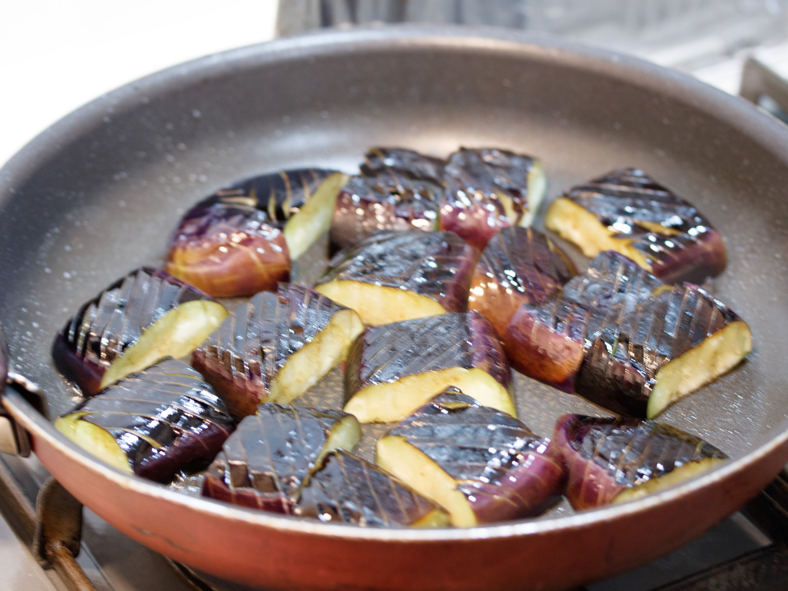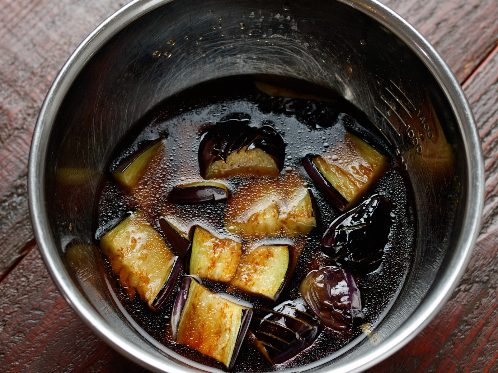 揚げ焼きしたなすを、”つゆ”につけておくこと。