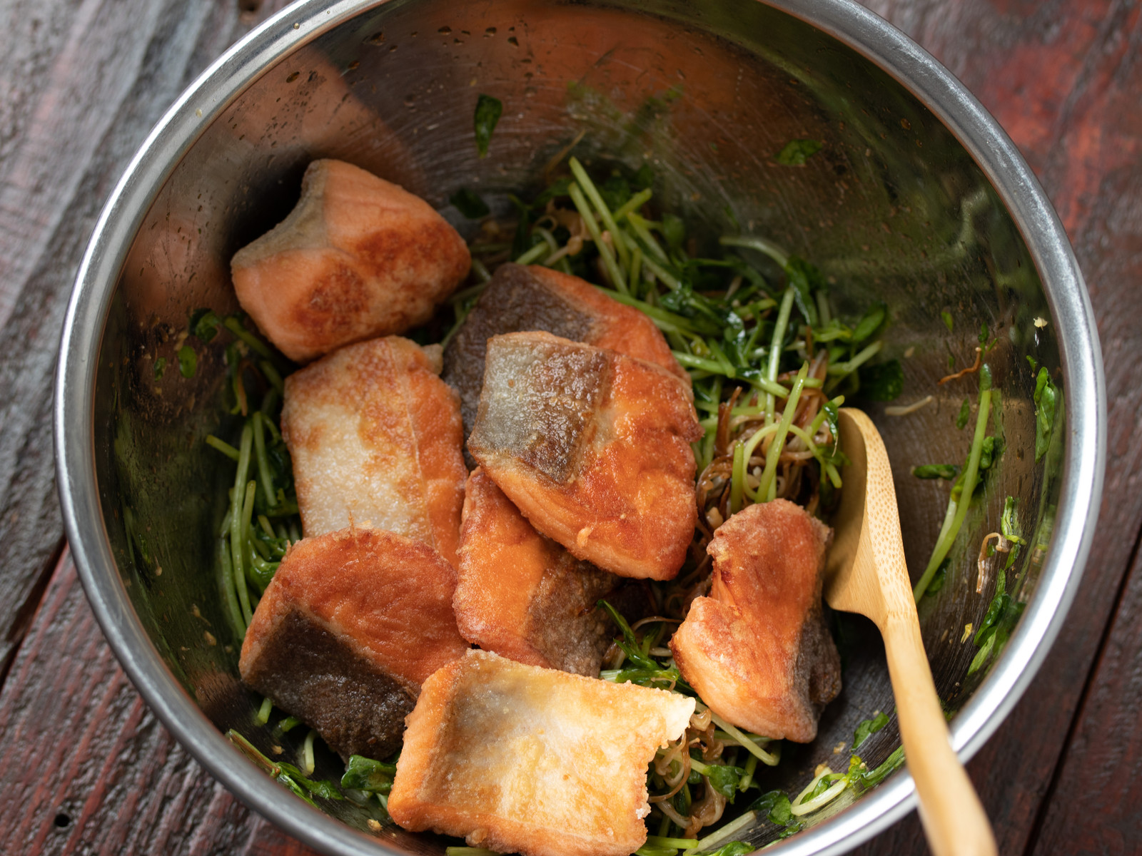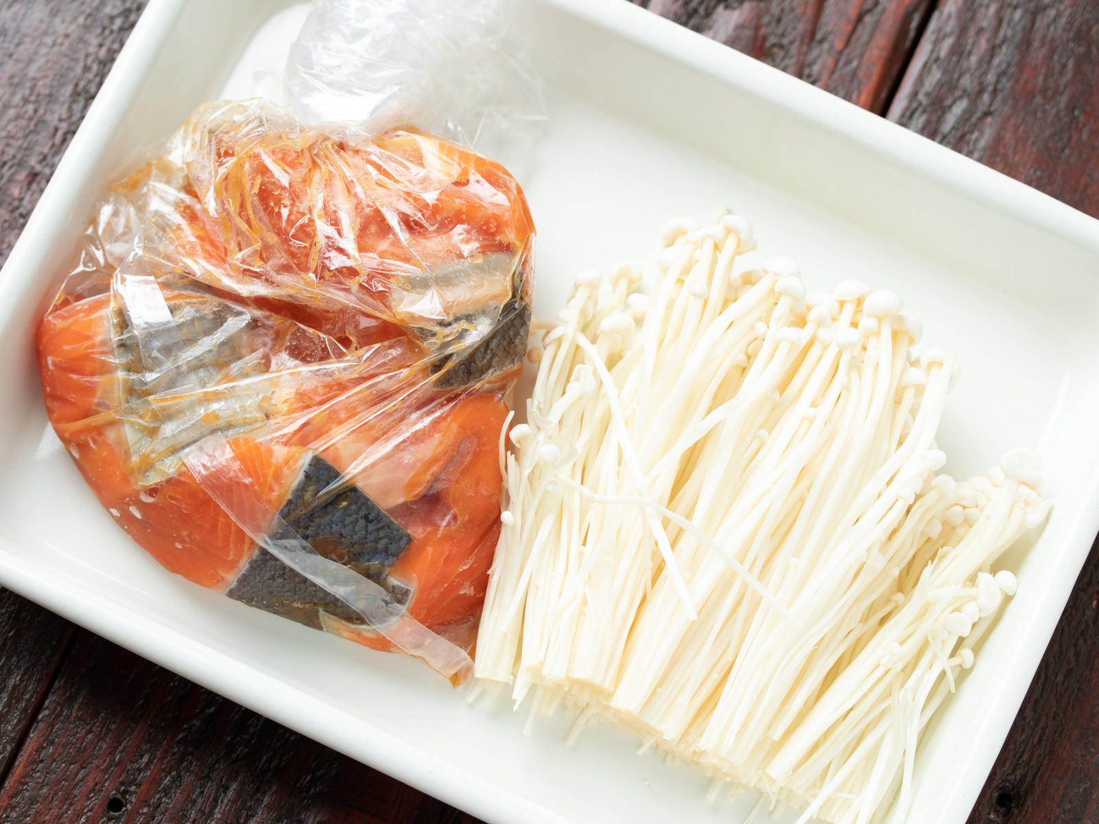 季節の変わり目にぴったりの栄養満点作り置きおかず♪ 鮭と豆苗の赤と緑のコントラストがとっても綺麗。 また、豆苗のシャキシャキ食感とえのきのカリカリ食感もポイント。 旨味もたっぷりなので、野菜が苦手なお子様も美味しく召し上がっていただけますよ♪