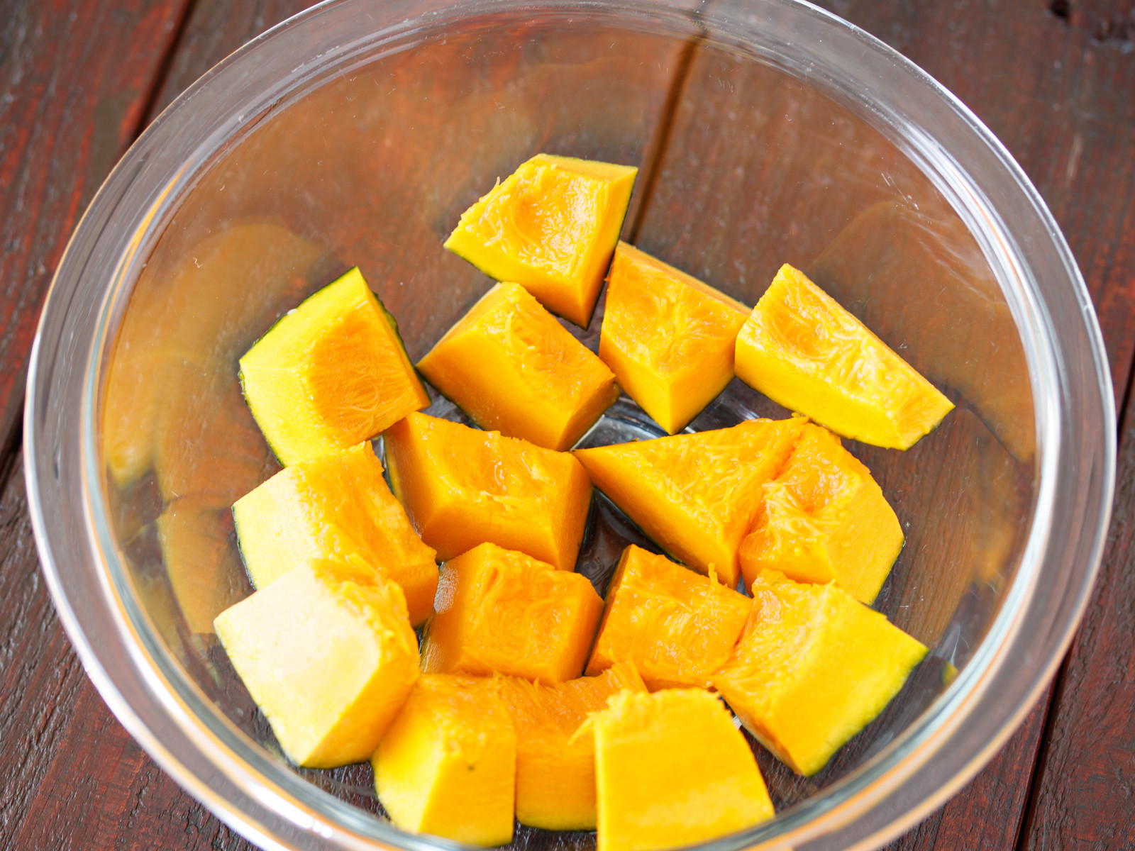 2.耐熱容器にかぼちゃを入れて、水小さじ1(分量外)をふり、ふんわりラップをし、電子レンジ600wで約3分加熱する。