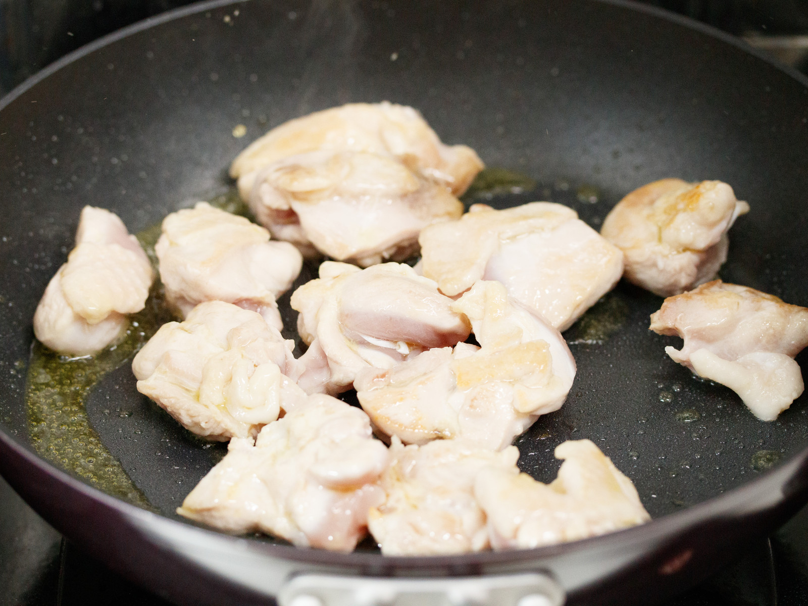 フライパンで、鶏肉・玉ねぎ・レンチンしたかぼちゃを炒め