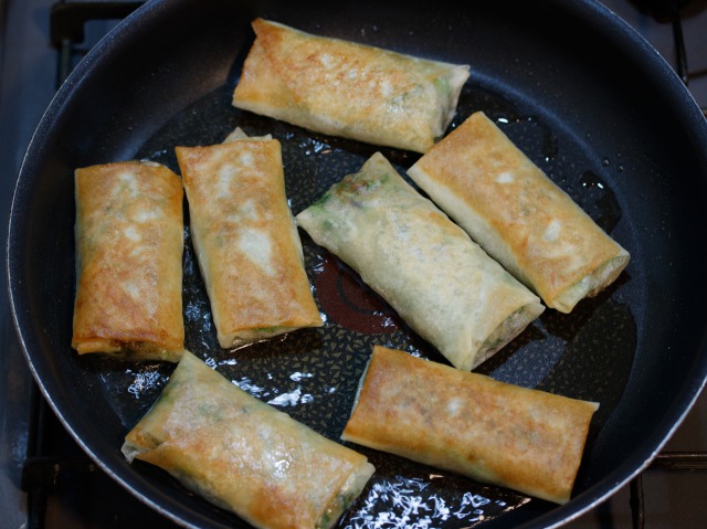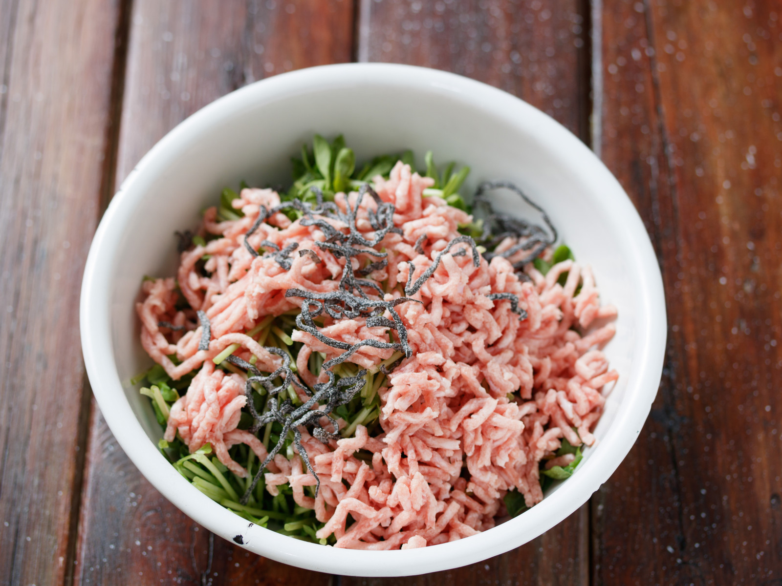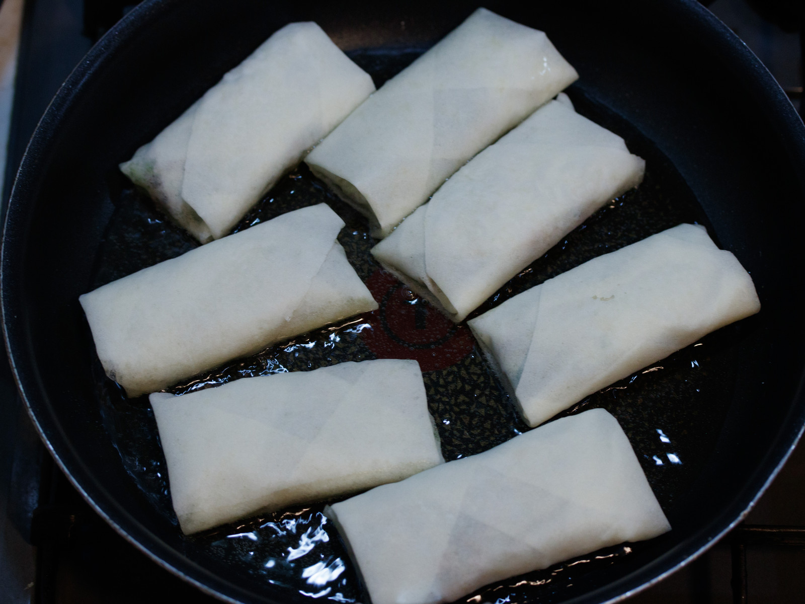豚ひき肉・塩昆布を混ぜ合わせて春巻きの皮で包み