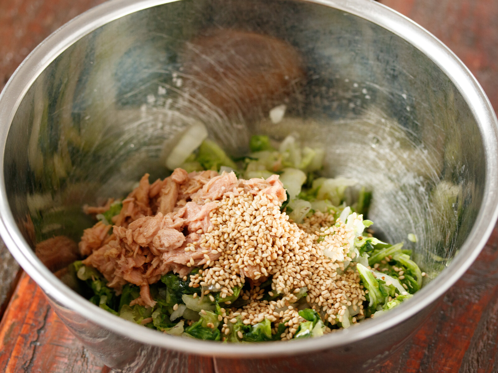 『白菜と油揚げのじゃこポンおかか蒸し』
