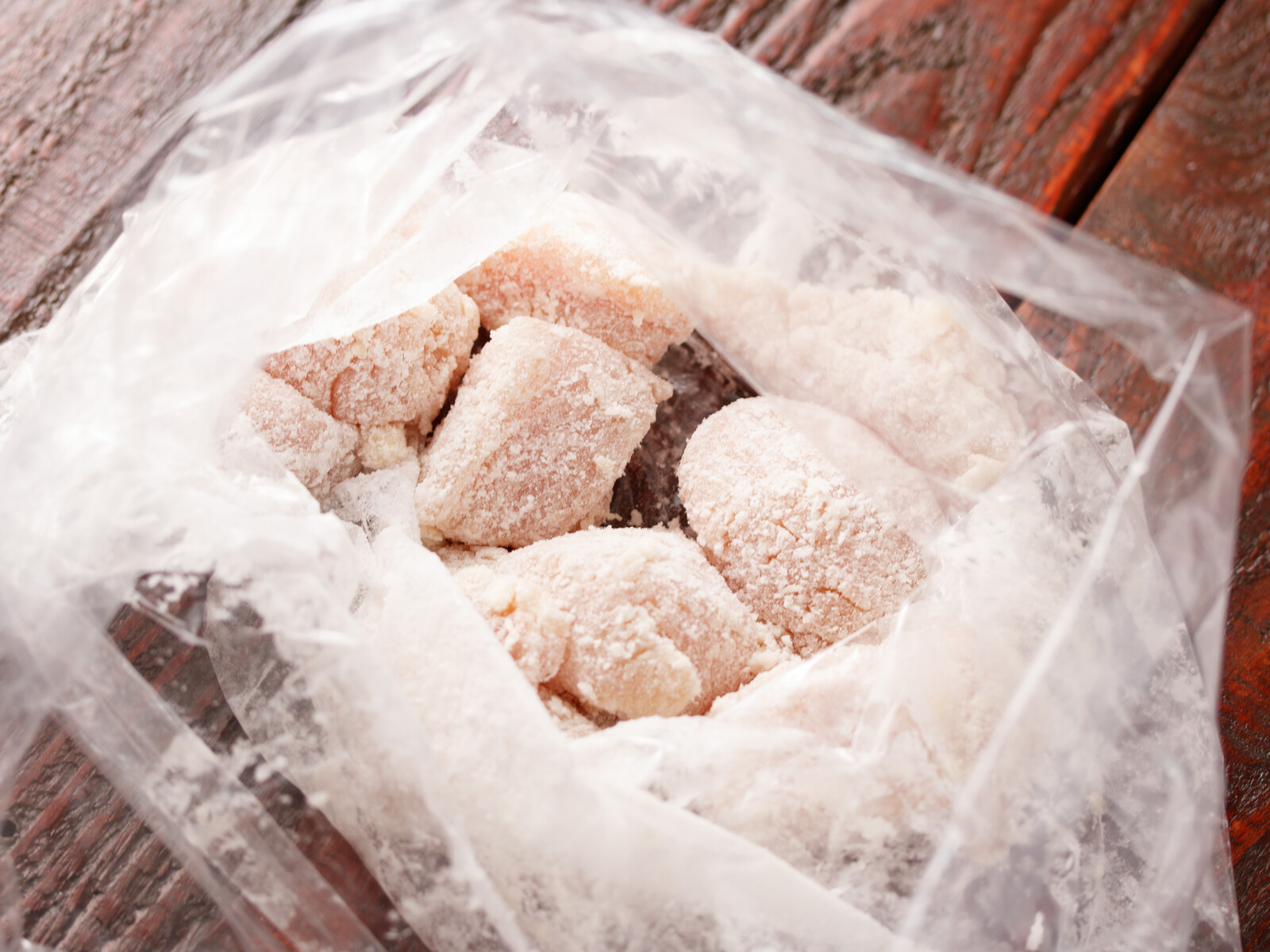 1のポリ袋に薄力粉を入れてよく揉み込み、粉っぽさがなくなったら片栗粉をまぶす。(私は、新しいポリ袋に入れてまぶしましたが、バットに取り出してまぶしても◎)