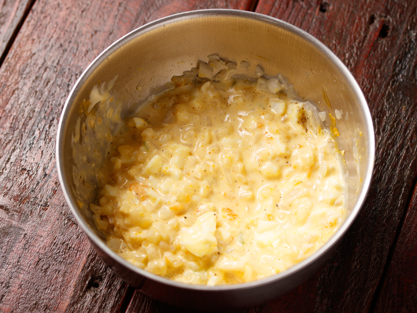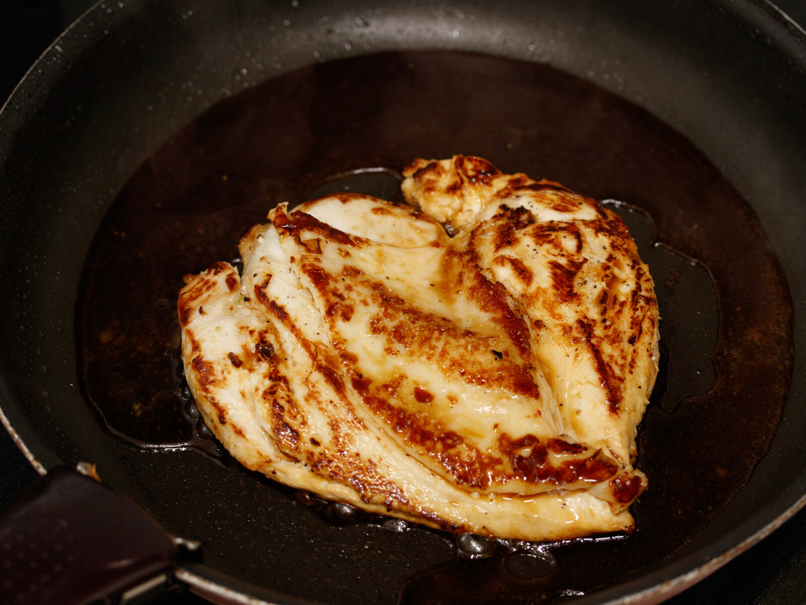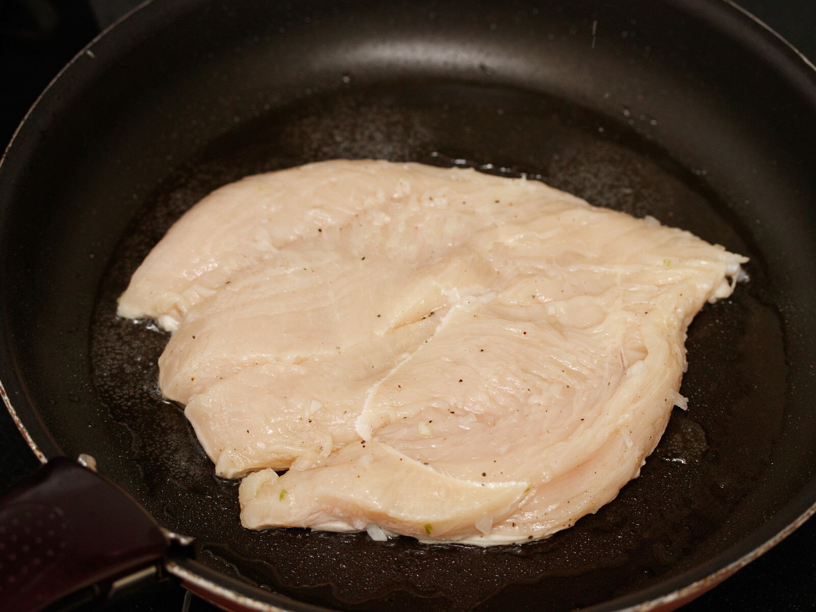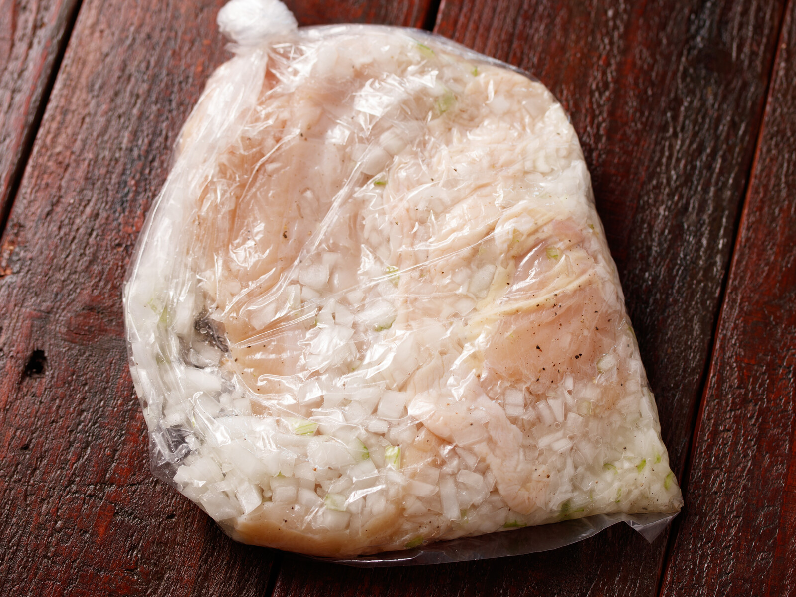 ①むね肉に玉ねぎたっぷりの下味を揉み込む。