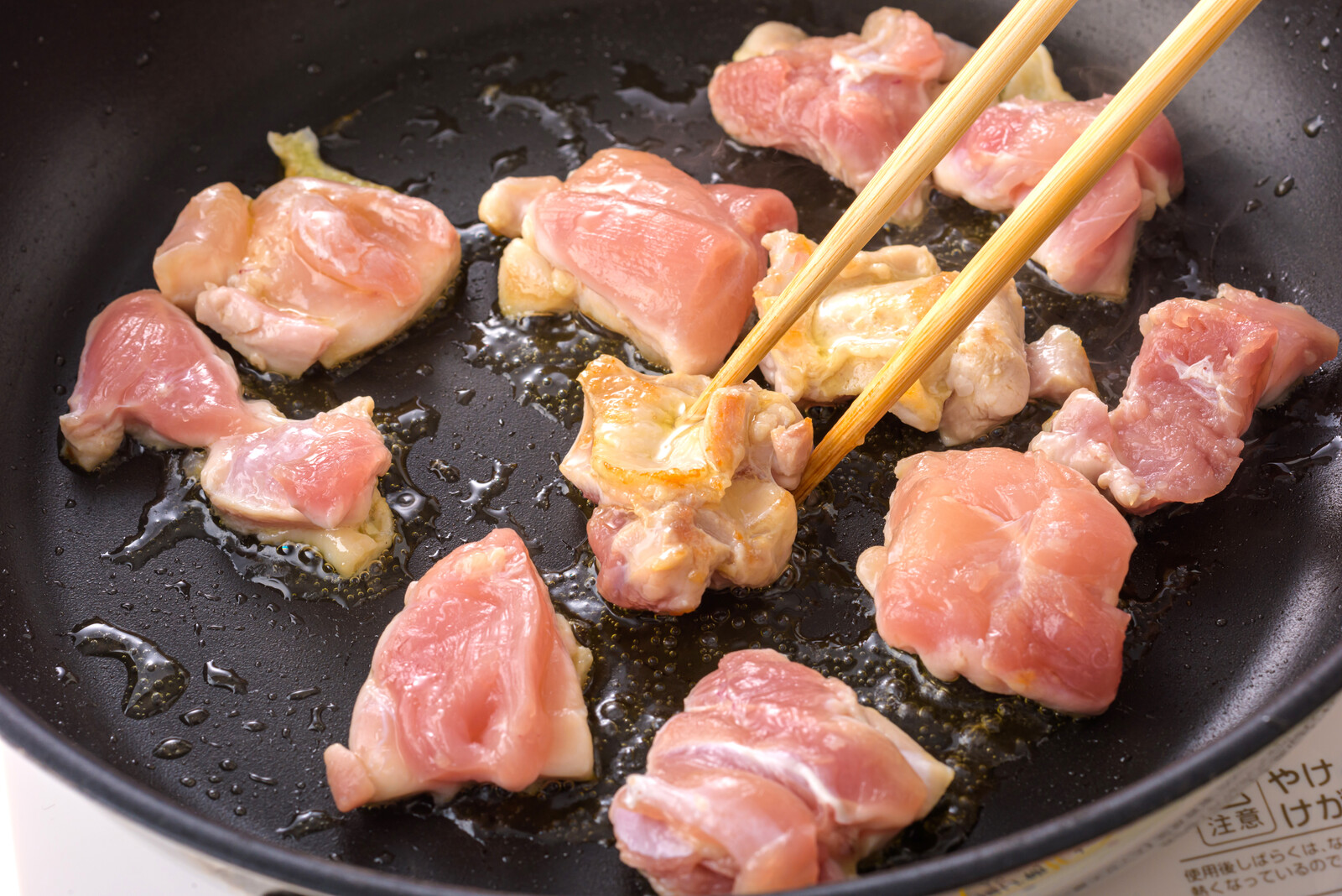同じフライパンに、鶏肉の皮目を下にして入れ、途中上下を返して3分ほど両面をサッと焼く。