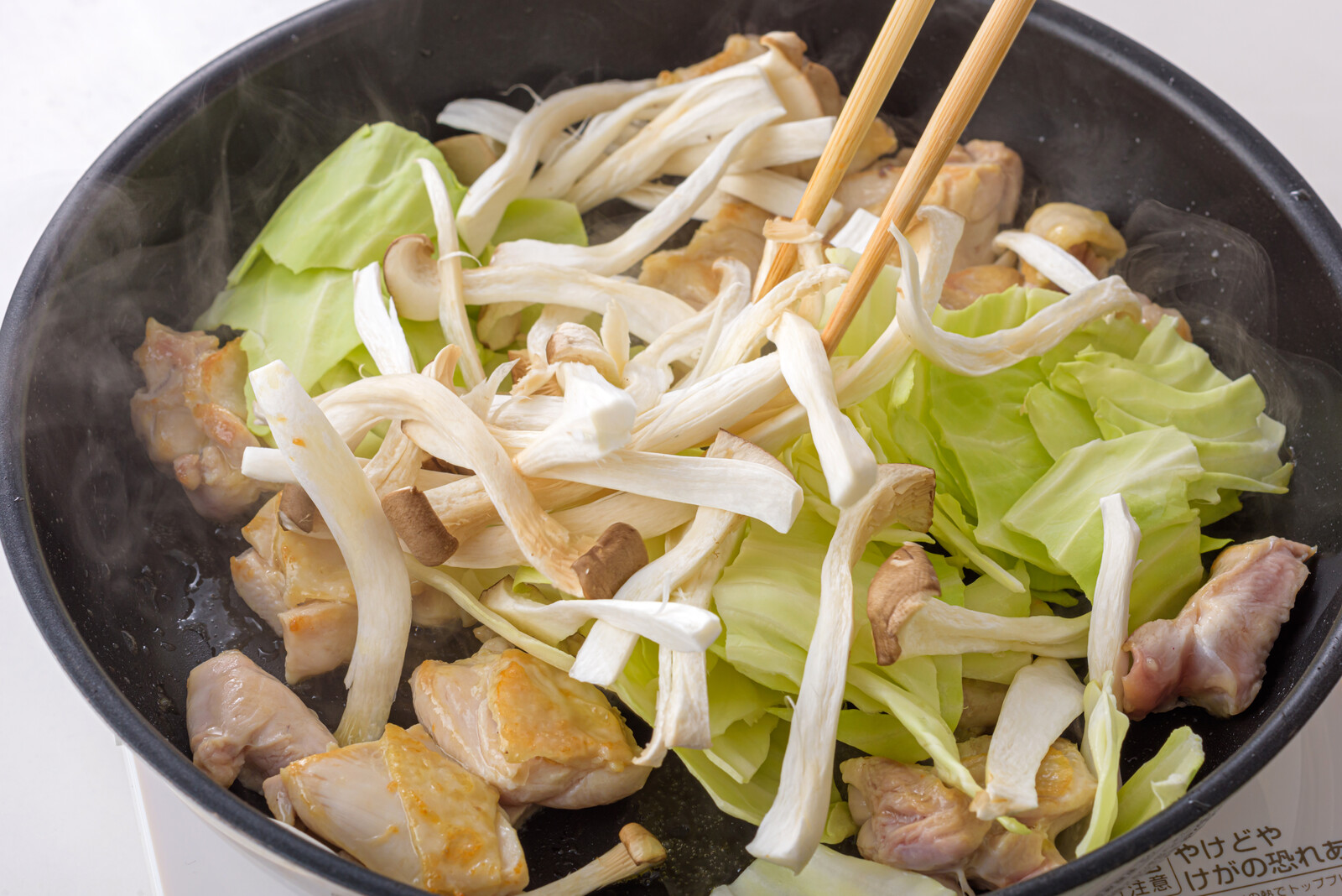 キャベツとエリンギを加えて、キャベツがしんなりするまで炒める。