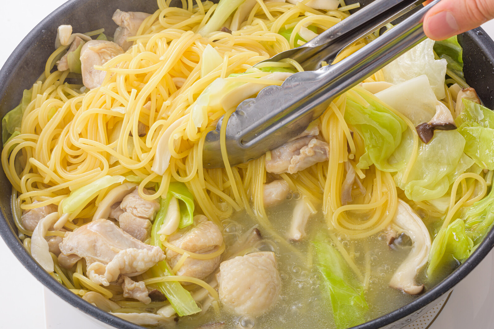 半分に折ったパスタと【A】を加える。パスタが煮汁に浸かるように具材を上に乗せ、蓋をして弱めの中火でパスタの袋の表示時間より3分多く煮込む。